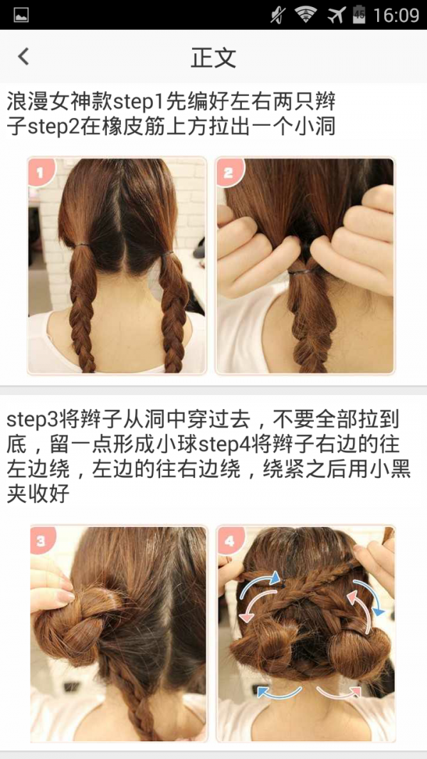 1、扎发技巧模块详细介绍扎头发的方法,每个步骤都有文字和图片详细的描述