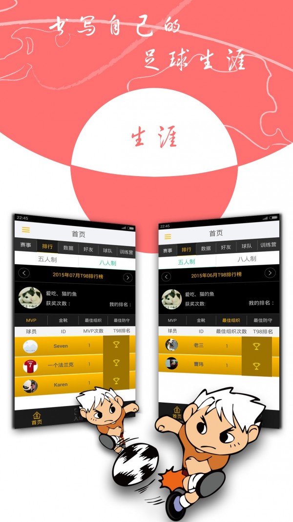 为你记录每一场比赛的表现,包含得分、助攻、出场时间等诸多个人数据,让你真正书写属于自己的足球生涯。