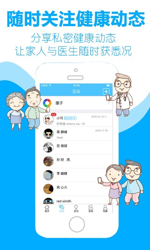 “健康中心”是一款针对患者日常健康管理的智能手机应用。我们为患者营造了一个私密的健康社交环境,用户可以通过“健康中心”与家人好友以及信任的医生进行交流互动,分享每天的自我监测数据以及其他信息。