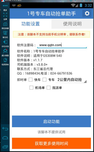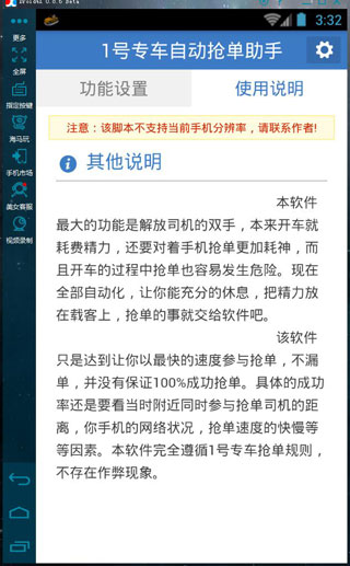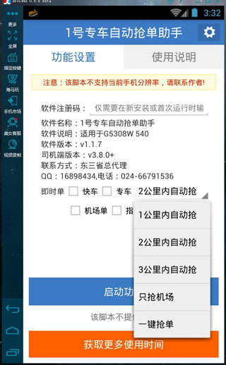 一号专车自动抢单助手安卓版是一号专车APP司机端的辅助工具,它能帮助司机用户们自动抢单,用户可自选范围!超级实用,帮你获取更搞的收益!