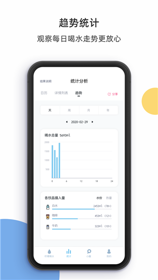 1、观察每日喝水走势不担心,我们提供日历和趋势图两种呈现方式,帮您最有效的制定喝水计划和展示您的喝水记录。