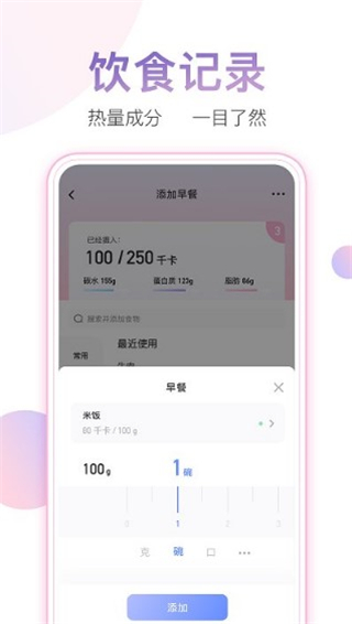 1、体重列表、柱形图、趋势线、百分比圆环等多种方式为您展示减肥进度,支持目标完成时间预测。
