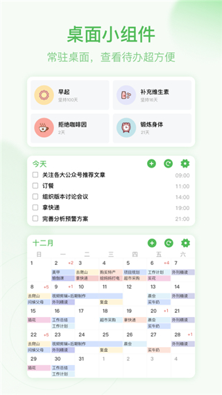 该软件还可以在桌面上生成小组件,为您的生活添加更多提醒。感兴趣的用户就来下载朝暮计划吧,该版本的软件有着完全免费的各种功能,非常实用。