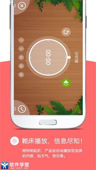 该软件是一款非常实用的工具,小伙伴们可以通过此软件进行定时,尤其是对于起床有困难的用户来说,它可以帮助用户们叫醒起床哦,而且每一次定时起床可以获得丰厚的奖励,该app中还有超多的铃声可以使用,让你知道今天的天气变化,很是贴心的一个app哦。