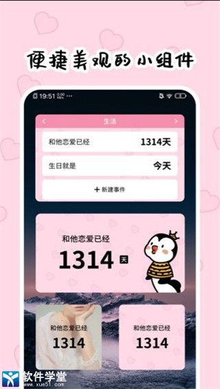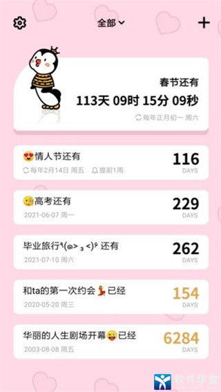 该软件是很受女生用户喜爱的倒计时软件。提供了各种萌萌的皮肤模板,你也将重要的日程一一添加其中,选项喜欢的模板使用。无论是学生族还是上班族都可以用哦,让你不错过一场考试、一次约会、一个重要会议安排等等,是一款帮你记录生活中重要日子的倒计时app,功能包含倒数日、正数日、记录纪念日、生日、传统节日等各种你关心的日子并及时提醒你,大家可以使用软件来进行一些重要日子和事项的记录,能够让你在这里更轻松的记录美好。