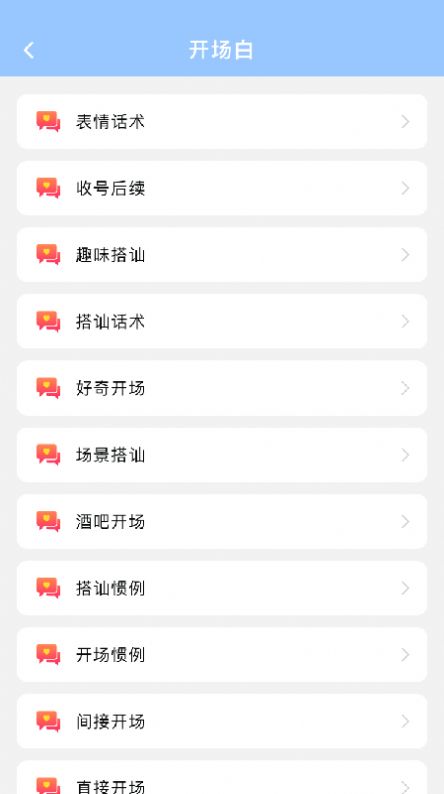 这款软件中,各种类型的话术资源都有,可以让您轻松交到女神!这会聊天是一款简单就可以认识好友的工具还有大量的技巧供大家轻松学习,带来了超多热门的话术资源,各类话题也可以在平台上搜索,直接输入关键词就可以获取回复的内容,为你提供更多免费话术。