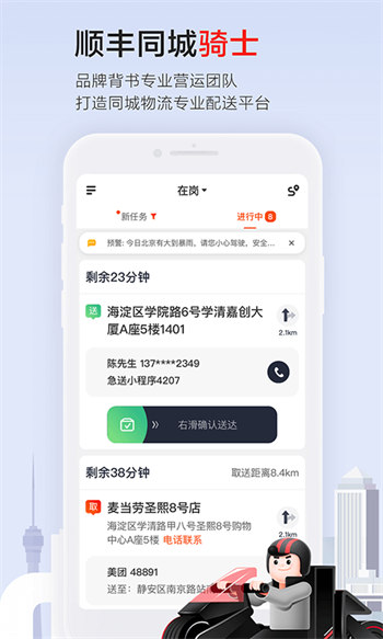 在同城,一样可以通过这款软件快速将自己的物品送出,效率高!这顺丰同城骑手是一款专门为同城顺丰打造的接单配送服务软件,用户可以先经过培训就可以轻松的上岗,系统会为每个骑手分配工号,就可以实时的进行接单,需要用户实名认证以及各种健康证,能够为骑手分配最优的配送路线,提高效率。