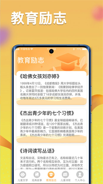 拥有海量的有趣绘本,可以开拓孩子的眼界,用户可以在平台查询到各种热门小说资源可以进行免费阅读。具有各种专业课程可以进行学习,,能够提高孩子的学习水平能力,具有生动的教学场景。