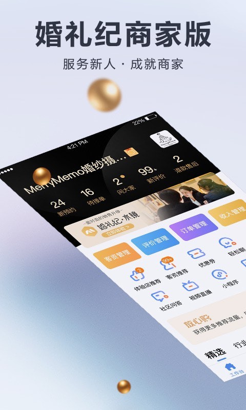婚纱店的老板们,我们可以用这款软件管理自己店铺,绝对非常靠谱!这婚礼纪商家端是一款手机婚礼商家店铺管理软件,它能够给商家带来更便利和更方便的管理,订单实时掌握,及时发布各类商品信息,管理好用户信息,账单查收,用户的沟通等等多方面的为自己和用户带来方便,让你管理店铺更轻松,赚钱更容易。
