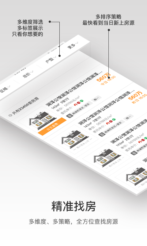 1、【搜尽房源】每天10亿次数据处理,搜尽各平台全渠道,清洗、去重,不放过一套房源。