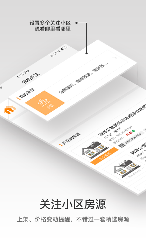 2、【关注小区】设置关注多个小区,房源上架、价格变动一目了然,更有消息推送、短信推送,不错过一次机会。