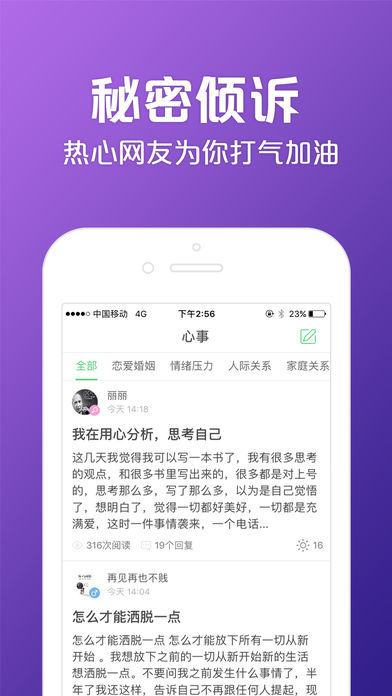 秘密倾诉app这是一个网络心理树洞,可以使用网络昵称匿名发泄心中的秘密,无论是恋爱秘密,情感秘密,职场秘密,还是家庭秘密,都可以宣泄。失恋、劈腿、感情不顺、抑郁焦虑、学业问题、人际交往问题统统可以这里大声说出来。是个能让你使用网络昵称匿名发泄心中秘密的心理健康平台。通过秘密倾诉app你可肆意吐槽心中的苦恼,在线咨询心理医生问题、预约咨询服务等。