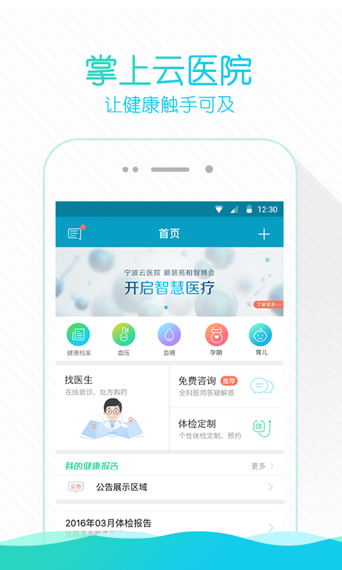 掌上云医院——让健康触手可及。是东软熙康健康科技有限公司基于云医院业务运营基础所打造的权威专业的医疗和健康管理服务平台。在这里不仅能够查看到您的体检报告、详细解读、对比分析等,还能够在线免费咨询全科医生、寻找大医院的知名医生进行网络问诊、在线随诊、签约家庭医生等,以及管理家人的血压、血糖、专属健康档案,享受到专业的健康评估和健康指导等。