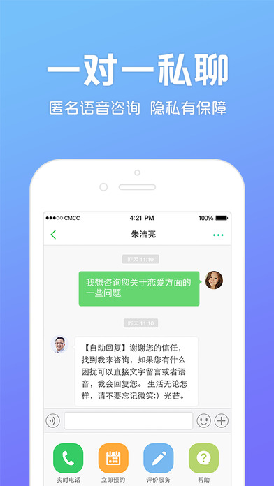 3、专家咨询:如果专家的回复、倾听帮助到您,您可以直接发起私聊,通过语音、文字快速问诊,并预约正式咨询。