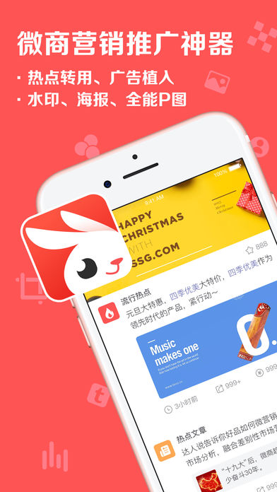 微商营销必备的做图神器,简单快捷的实现水印、标签、海报等微店主的作图需求,大大提高图片处理效率。修图、拼图、水印贴图一分钟快速搞定,用微兔随时随地都能做出你想要的完美效果。 所有图片可一键分享至朋友圈,微信客户,营销推广、客源加粉so。