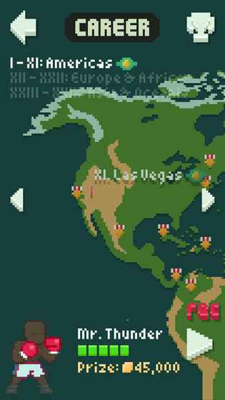 玩家在游戏中需要帮助拳击手战胜各种敌人。游戏模式可选两种:职业赛和快速战,玩家可以根据喜好来选择对战模式。喜欢这类像素画风的玩家可以来试试。