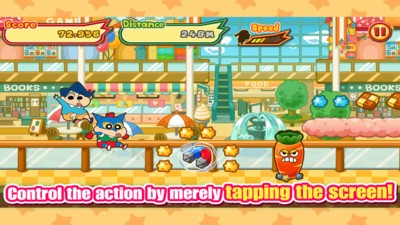 ●由于蜡笔小新大力飞奔向前,躲避障碍,通过点击屏幕收集糖果!