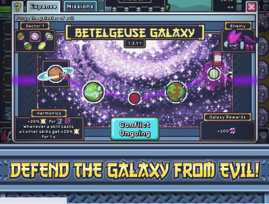 3.发现一个具有独特的改变游戏机制的星系,执行任务以收复行星,赚取资源,制作和升级新的闲置技能。