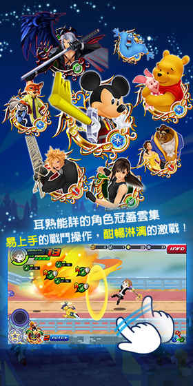 在《王国之心Unionχ》当中,玩家可以藉由点击或滑动这种智慧型手机特有的简易操作,充分探索迪士尼世界,体验大快人心的战斗。玩家将成为钥刃使者,强化钥刃或收集角色奖牌,还能换上各式风格的造型服饰,探索迪士尼的世界。