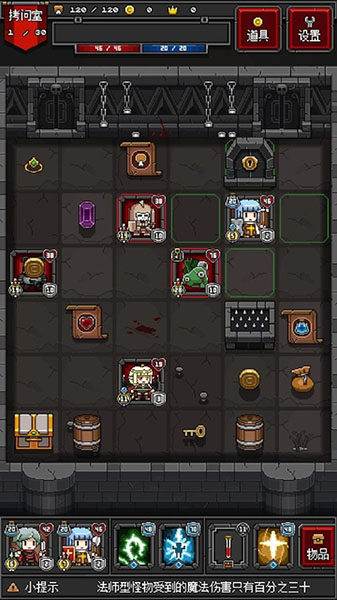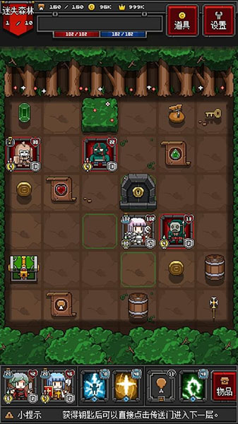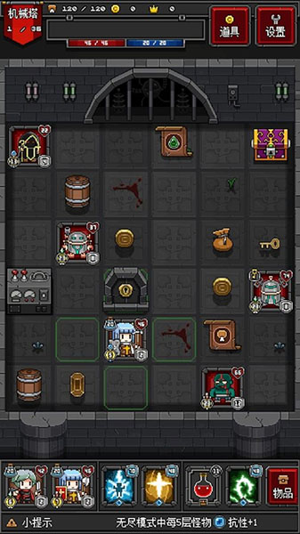 随机元素意味着有更多样的组合,可以玩(肝)的内容更久。兴奋感就像相声抖包袱,2分钟1个小包袱,5分钟一个大包袱,如果不能持续出兴奋感,roguelike就会索然无味,如果玩家10分钟就走了,那你设计100天的游戏内容就没有任何意义。游戏玩法类似不思议迷宫,在一个6*6的格子中杀怪战斗,拾取物资。
