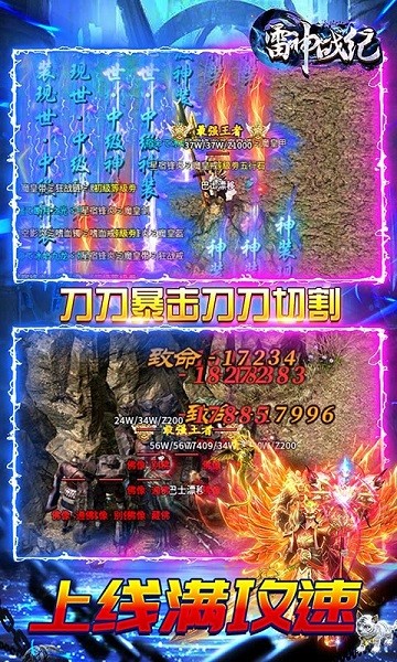 在这边,我们可以用这款手游来放松疲劳的自己,每一个攻击都非常过瘾!这雷神战纪手游将记忆中最经典的传奇玩法复刻,复古游戏画风,战法道三大熟悉的职业任你选择,高清精美的游戏画质,超高的装备爆率,战斗特效绚丽,火爆传奇就此开始。