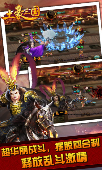 《土豪三国》摒弃了枯燥的回合制战斗,将战斗变化为自由阵型组合的即时战斗,使得战斗节奏更加畅快,同时又保留了卡牌游戏经典收藏与组合玩法,游戏有丰富三国武将卡牌可以进行收集,并根据自己的阵容进行组合。更有丰富的游戏活动:名城夺宝、武将竞技、天下争霸等活动;丰厚的游戏奖励:每天登录抽元宝,击败boss获高额元宝奖励。