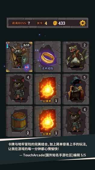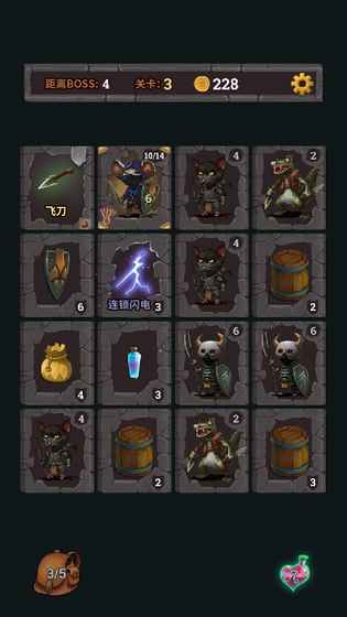 《地牢与宝藏》是一款规则简单,充满着魔法元素的卡牌RPG游戏。你可以控制你的英雄牌在2*2,3*3,4*4的卡牌阵中上下左右移动。每次只能移动一格,每次移动都会消灭不同的卡牌。你需要操控你的英雄牌——消灭怪物、打开宝箱、喝下血瓶、收集金币、发射火球、躲开尖刺陷阱、最终打败BOSS。