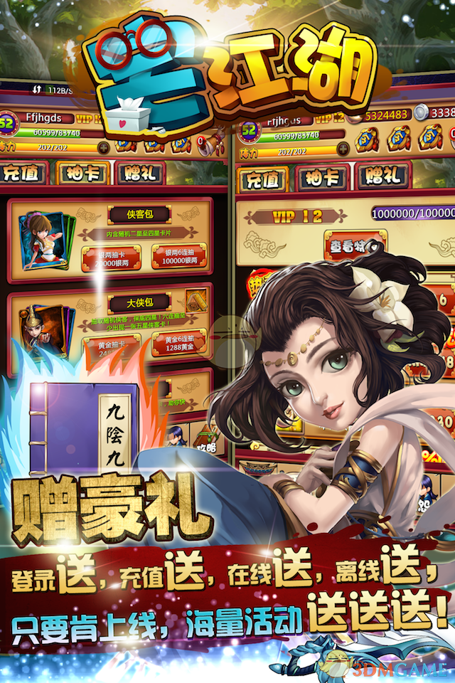4、赠豪礼:登录送,充值送,在线送,离线送,升级送,海量活动送送送!紫卡有木有?有!橙卡有木有,还有!只要肯上线,什么绝世大侠最强武功,通通不要钱!