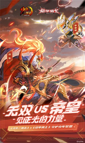 少年三国志铠甲勇士联动版,无双VS帝皇,见证光的力量!《少年三国志》X《铠甲勇士》破界联动正式开启,守护亿万少年梦想!限定联动名将帝皇侠热血驾临,还有刑天曹操、炎龙赵云、捕将大乔、黑犀吕布四款限定联动皮肤登场,这个夏天,让我们铠甲变身,热血战斗!