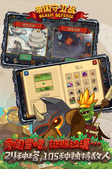 每一幅地图有不同的防御塔,帮助玩家抵抗敌人,解锁拥有神秘技能的英雄完成战斗;