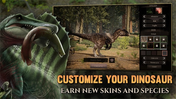 还能自由diy,玩法相当自由,以恐龙为主题的生存mmo游戏,玩家要在充满复杂ai生物和多达200个其他参与者的丰富生态系统中扮演恐龙,探索自然环境,并想办法避免死亡。玩家可以自行决定恐龙的造形、肤色、标志等等,想要崇尚自然肤色。