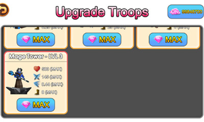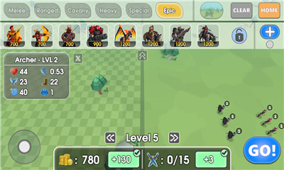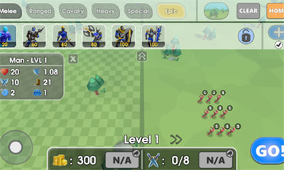 游戏中只有一个需要玩家注意的,决斗时游戏给玩家的金币不多,玩家需要根据仅有的金币来布置最强的或者是能够获胜的队伍。玩家还可以为自己的兵种升级,让他们的战斗力提升,每通过一关就能获得钻石,虽然有点少,但是累积起来还是能够使的你的队伍强大起来的!