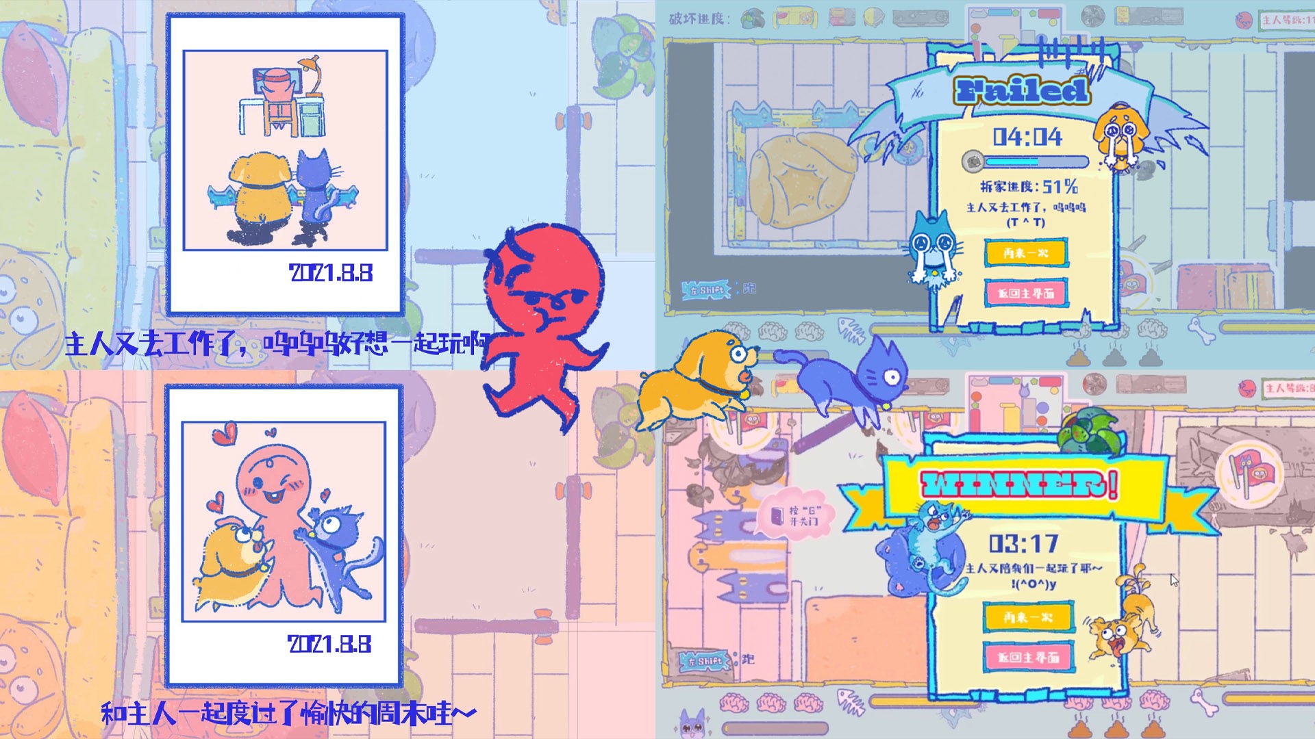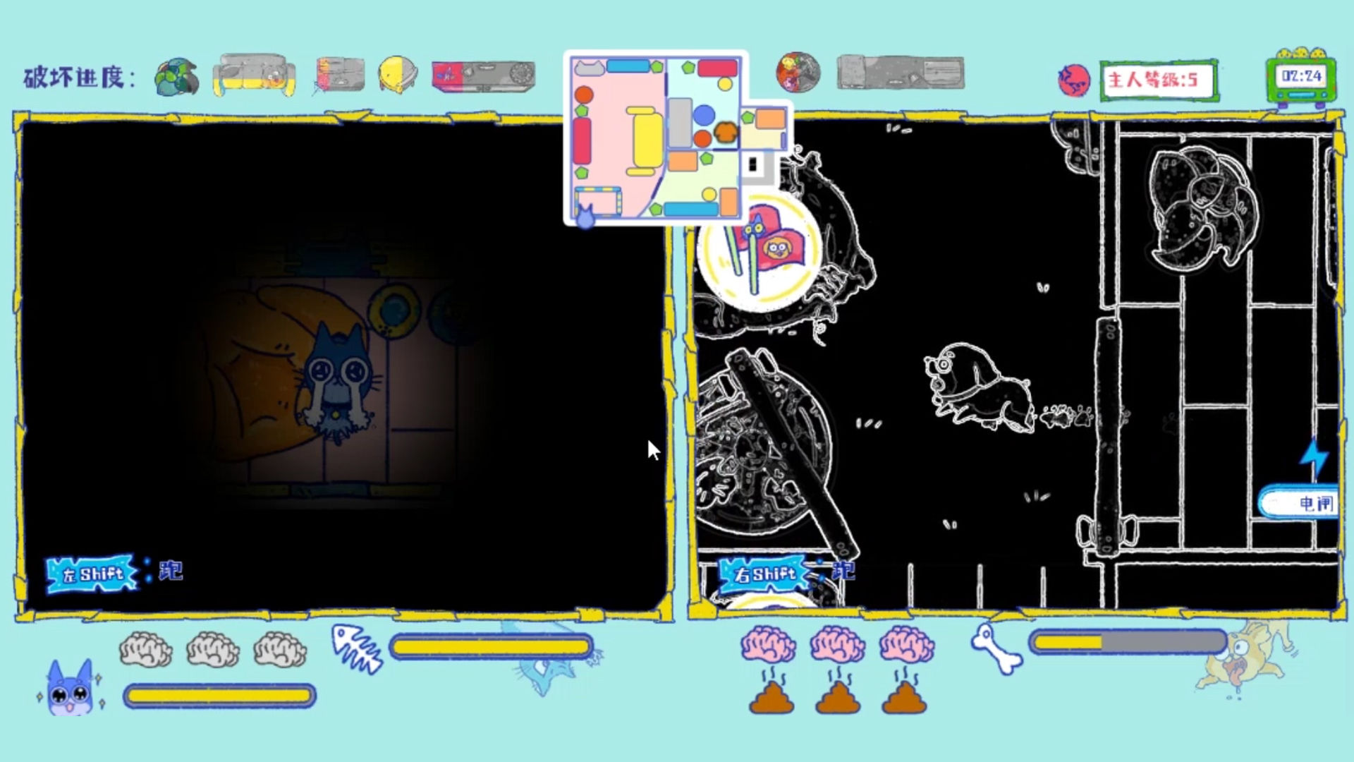 两个玩家共同操作一台电脑,分别扮演猫猫和狗在家里搞破坏,为了让主人多陪自己一会儿。