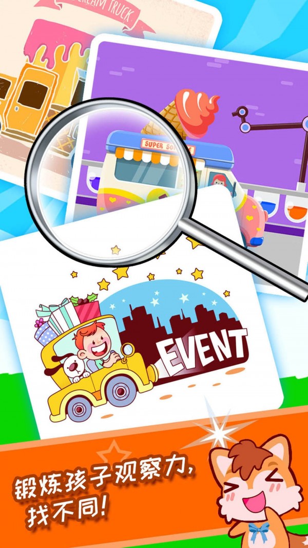 还能培养孩子对汽车的兴趣,而游戏的要求是在两种相同的图片之中找到汽车的不同点,至少6个不同点之下,当遇到游戏困难的时候可以寻求帮助,但是能够提供的帮助机会比较少,需要孩子完成任务获得更多的机会,重要的是,这里设计了六大不同的游戏场景,能够带领孩子认知更多的汽车,了解更多汽车的用途。