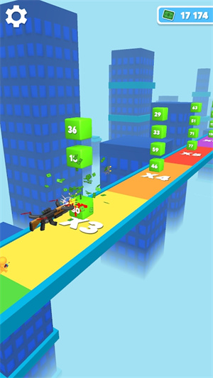 3、这款游戏采用了跑酷,结合了经典的射击游戏玩法,用自己的武器攻击障碍物,破坏这些障碍物。
