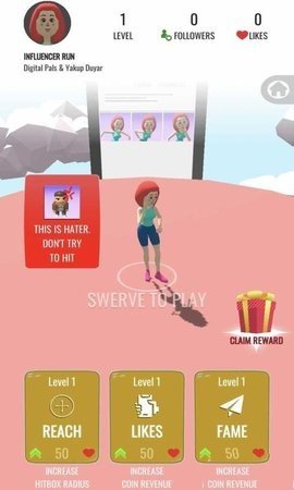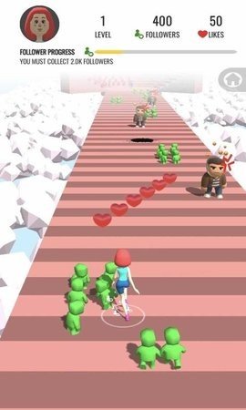 2.游戏的操作十分简单,玩家只需要控制角色左右移动来多收集关卡中的各种粉丝和金币道具和躲避障碍物就可以完成全部操作。