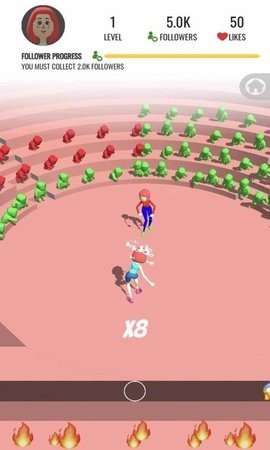 在关卡中,会看到路上有一大堆的人在中间,你可以去接触他们来吸引这些粉丝,带领他们一起走向关卡终点,碰到障碍物会减少粉丝的数量,在关卡的终点会进行一段舞蹈表演,在最后的舞蹈中,让这些粉丝成为真正的粉丝为你膜拜。对这款游戏感兴趣的各位玩家可以来我们试玩一下哟。