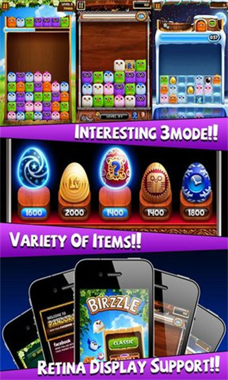 2、一种新型的益智游戏,当同时收集到三只以上相同颜色的小鸟时,淘汰后奖励一只具有特殊功能的小鸟。