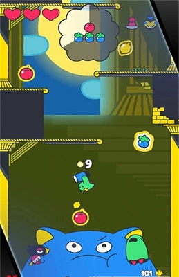 4、玩这个游戏的方法很简单。只要把水果切开,挤橙汁给下面追你的怪物吃。