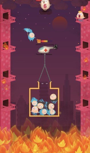 休闲创意小游戏,玩家需求在火海中,拯救被困的居民,每个性情不同居民,从楼中跳下的方向是不同的,你需求移动救活力悬下的篮子,接住每一个跳出来逃生的居民。
