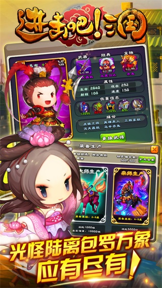 《进击吧三国》是以经典三国题材为游戏背景的一款Q版策略经营养成手游,游戏整体的人设十分Q萌有爱,表情刻画细腻传神又不失可爱的感觉,将经典三国时期的几个著名人物特点都体现出来了。背景建筑以三国田园风为主,游戏配音欢快有趣,UI界面给人整体的感觉还是比较舒爽的。