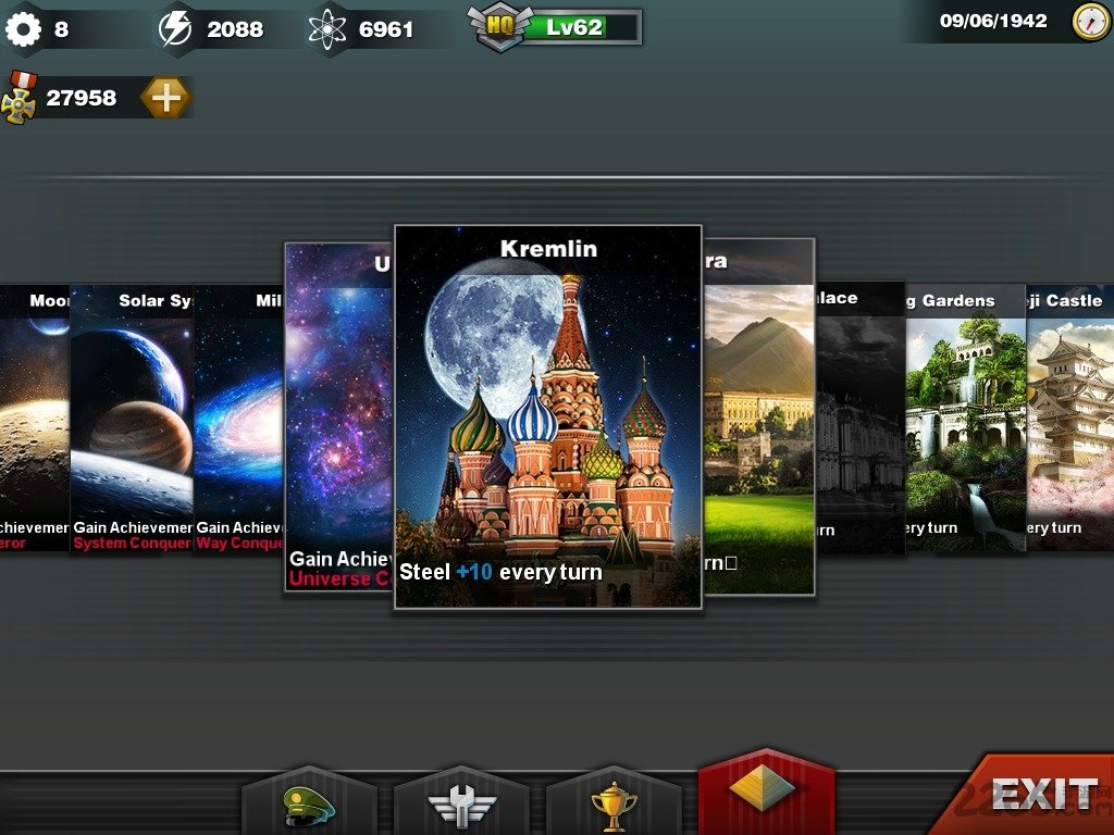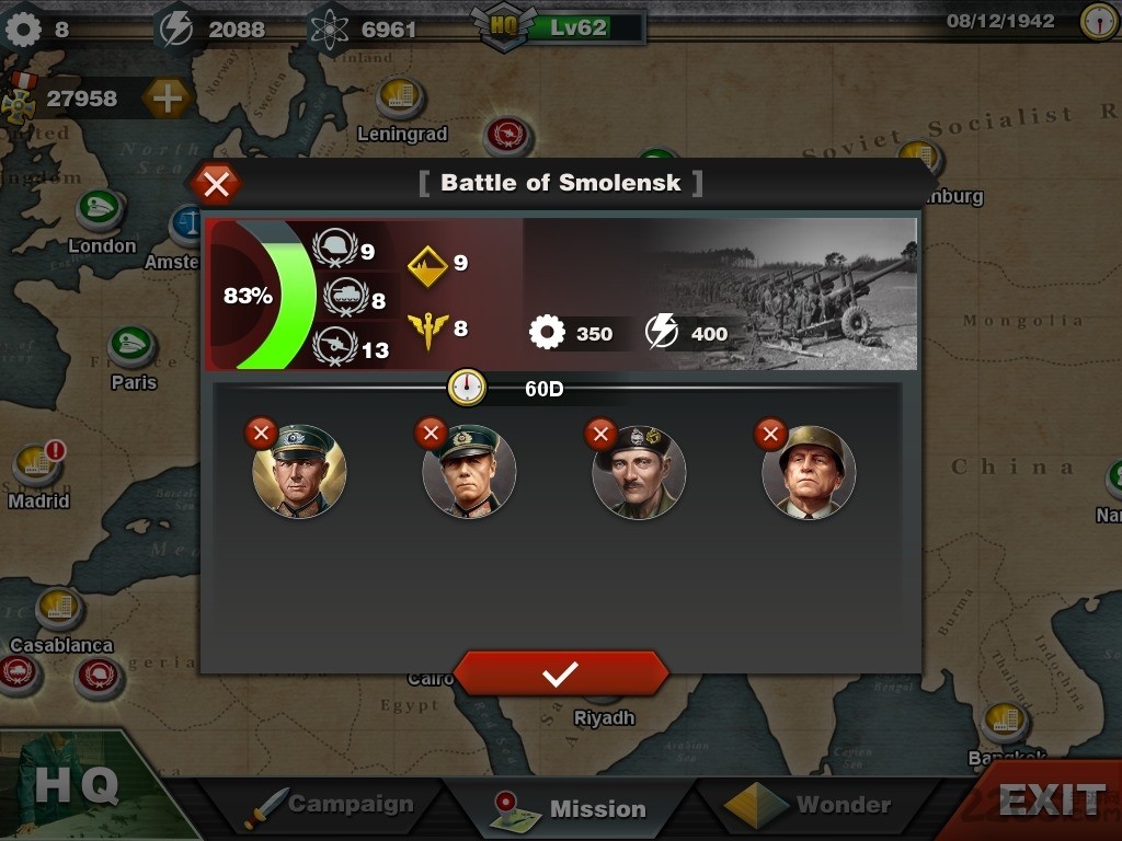 游戏还包括32场历史战役、150次军事任务和45次挑战动作。在游戏中,玩家可以选择不同的营地和国家,不同的营地和国家会得到不同的奖励。12科学技术研发、各种常规武器、海军、空军、导弹、核弹、空间武器等。