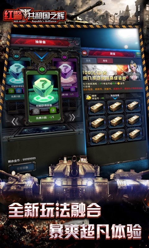《共和国之辉》是一部战争策略的手游。第三次世界大战期间,盟军和轴心国用各种高科技武器进行了殊死搏斗。战争场面宏大,节奏紧凑,画面一流,谋略饱满。游戏包括40多种高科技武器,100多种独特的装备部件,10多种能影响战局的指挥员技能,玩家可以根据自己不需要的战术需求自由组合搭配。