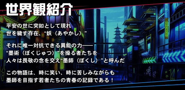 游戏中玩家将担任培育「墨师」的「墨守高校」新上任的老师,与各个个性丰富的学生们一起拯救未来,与对抗令世界秽浊的「妖」进行战斗