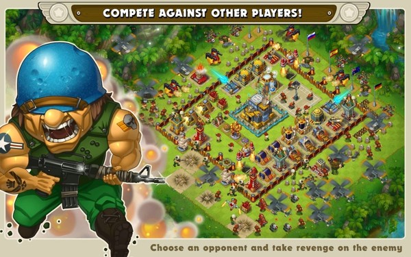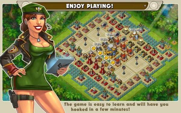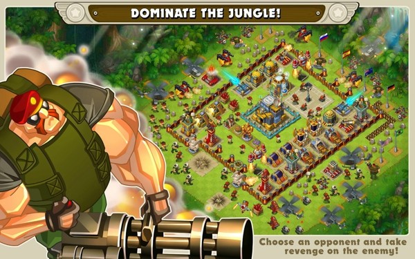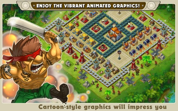 《丛林激战 Jungle Heat》是一款模拟经营游戏,玩家要在游戏中建造自己的基地,训练部队,主动出击或者接受其他玩家的“检验”并反击。游戏使用了卡通画风,建筑物和军队都以俏皮的漫画形态展现。