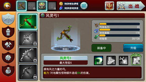 终极弓刚拿到时,可以明显的感觉到威力,觉得战无不胜,其实刚拿到时,它只是在攻击力上比普通弓要强一些,真正的威力还是要在不断的战争中才能得到提升,最好能保证拿到多重弓的技能,这样才能使终极弓的优势体现出来。多重弓开启的基本要求是:暴击达到3级,致命一击达到3级。