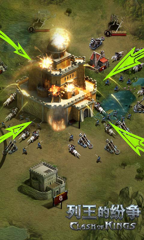 2、组建并搭配最强大的军队,领导您的狂战士、皇家骑士、重弩手、攻城塔和弩炮,碾碎敌军。