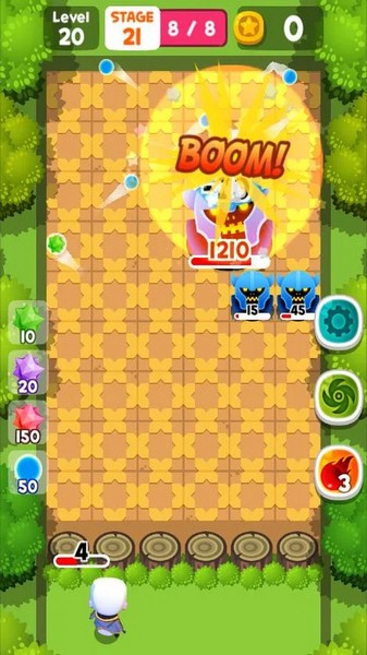 通过移动人物到对应格子上,消灭前方的怪物,身上显示的数字代表要攻击的次数,每一关的怪物数量都会增加,快来保卫你的家园吧。