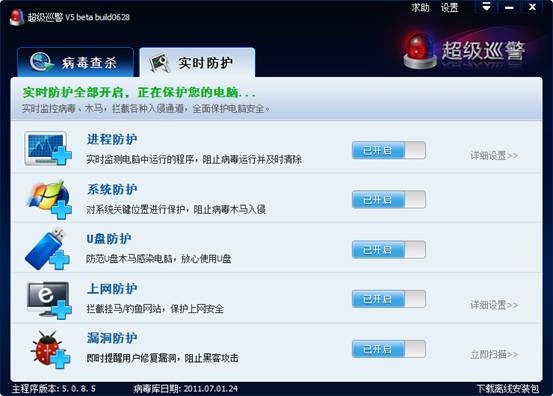 超级巡警是一款和360杀毒非常类似的电脑杀毒软件,占用资源少,杀毒能力强,可完全媲美商业软件。实时保护与主动防御,保护你账号安全,免除盗号烦恼。并且该软件可以完全兼容其他杀毒软件,你可以给电脑上个双保险。