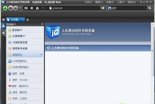 页面载入进度将在地址栏中显示,位于视觉的中心,页面载入情况一目了然。iQ浏览器将常用的功能按钮(帐户,收藏夹等)集合在软件的左侧,点下按钮就可立即展开。您也可选择关闭左侧功能条。